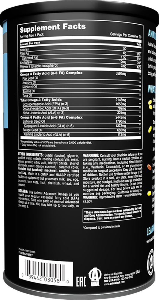 Animal Omega est un complément alimentaire à la formule assurant un apport élevé en acides gras essentiels, provenant de 10 sources différentes. Ici, chaque dose est emballée séparément (sachet), et inclut 1 gélule riche de 4000 mg d'oméga-3 provenant, entre autres, d'huile de lin, de saumon et de hareng, tandis que le reste des gélules assure un apport de 2500 mg d'oméga-6, en plus de combiner des ingrédients comme la lécithine, la L-carnitine et la lipase (enzyme).