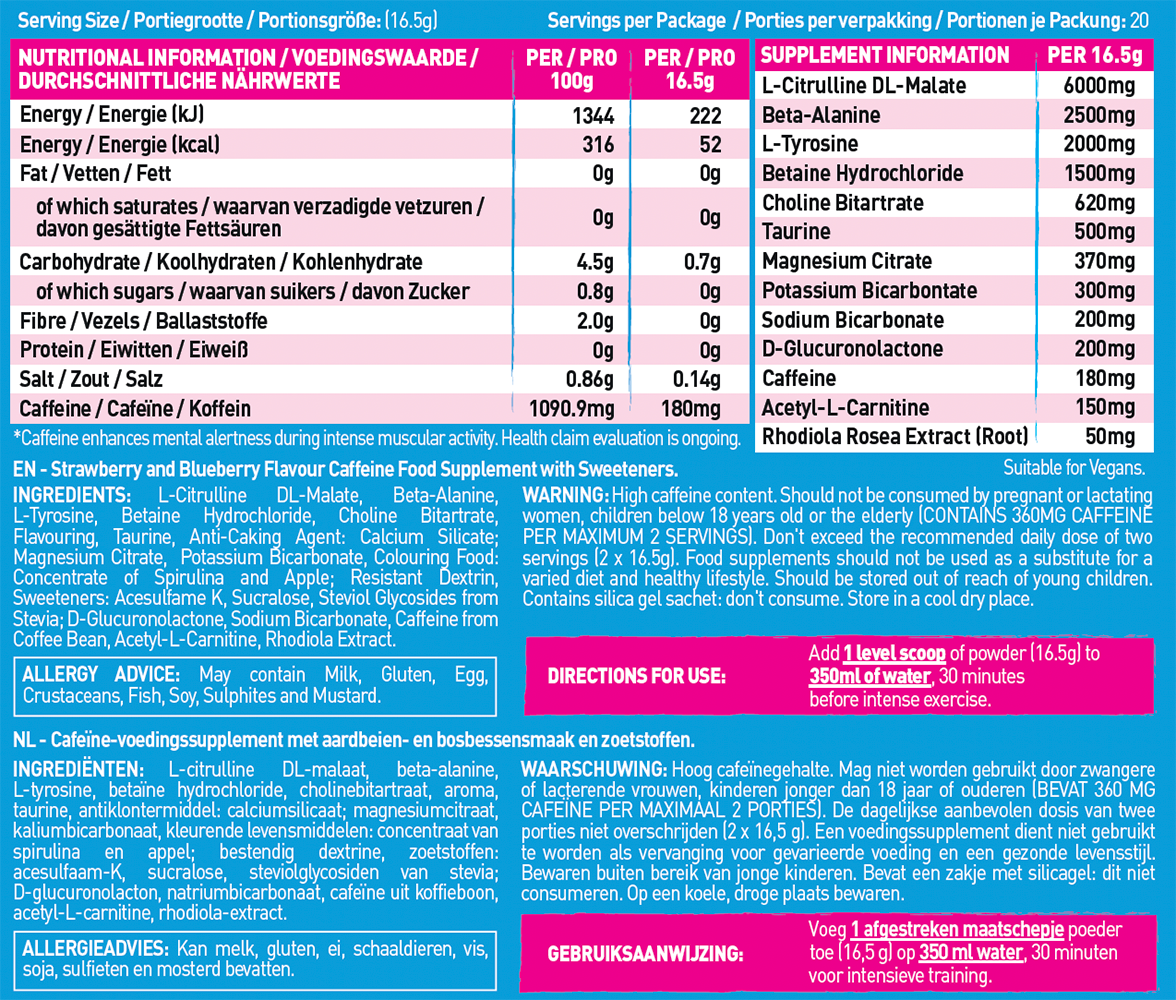 Ce pre-workout à la formule parfaitement étudiée combine 180 mg de caféine, 2,5 g de bêta-alanine, 6 g de L-citrulline DL-malate et 500 mg de taurine, entre autres ingrédients.