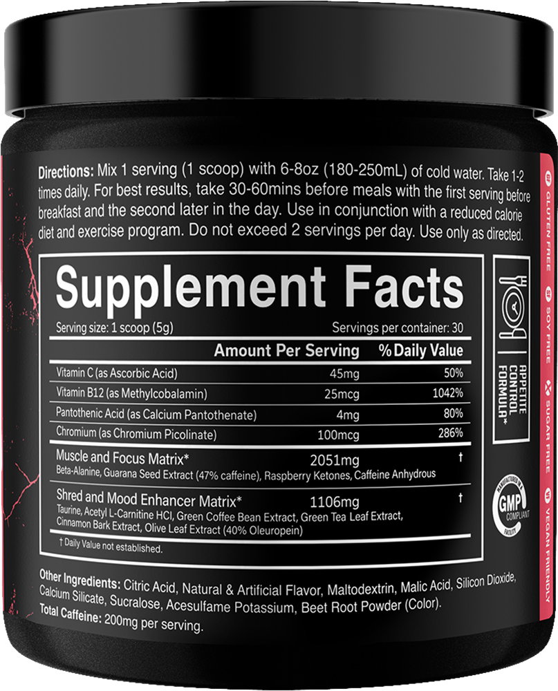 Parmi eux : vitamines, minéraux, acides aminés, extrait de thé vert, cétones de framboise, guarana et caféine (200 mg par dose).