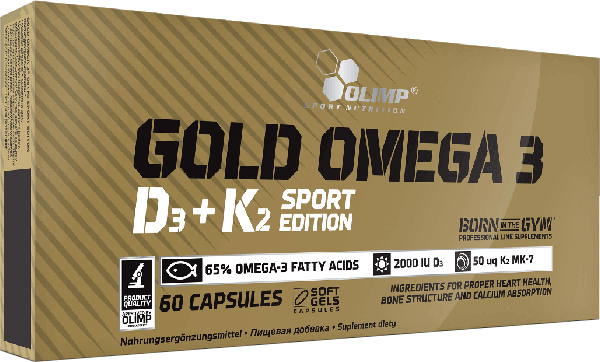 Gold Omega-3 D3+K2 Sport Edition d'Olimp propose une combinaison unique d'oméga-3, de vitamines D3 et K2. Chaque softgel concentre 650 mg d'oméga-3, dont 330 mg d'EPA et 220 mg de DHA. Un apport quotidien d'au moins 250 mg d'EPA et de DHA contribue à une fonction cardiaque normale. De plus, le DHA contribue au maintien d'une fonction cérébrale normale. Quant à la vitamine D, elle contribue au maintien d'une fonction musculaire normale, au fonctionnement normal du système immunitaire ainsi qu'à l’absorption et à l’utilisation normales du calcium et du phosphore. Enfin, la vitamine K contribue au maintien d'une ossature normale ainsi qu'à une coagulation sanguine normale. Cette composition en fait un complément idéal pour les sportifs.