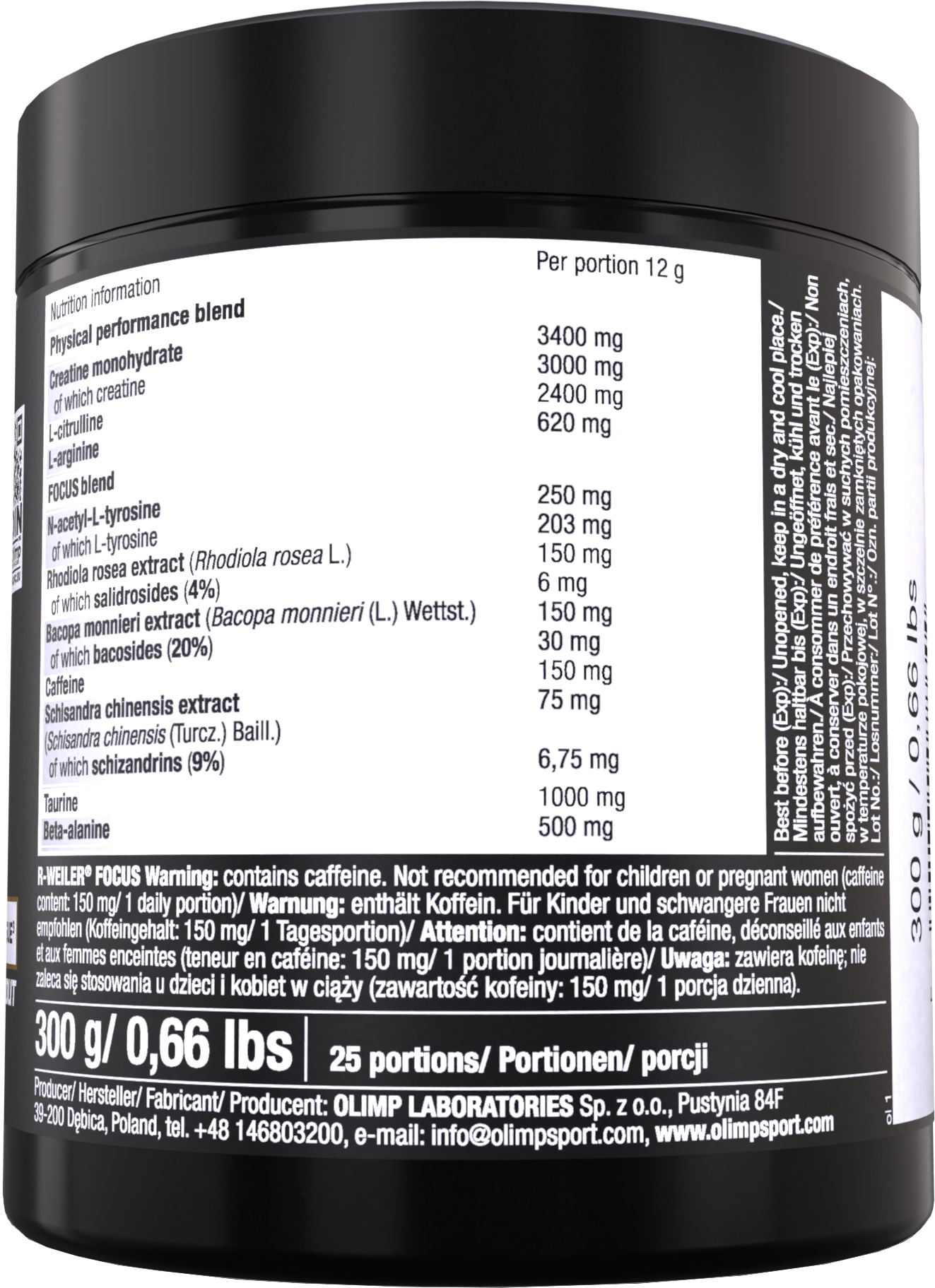 Olimp R-Weiler Focus Cola est un pre-workout à la formule complète, offrant une combinaison de créatine, de L-citrulline, de L-arginine, de taurine et de bêta-alanine, sans oublier les 150 mg de caféine par dose. Cette formule lui permet de fournir un effet stimulant à son utilisateur et d'améliorer sa concentration, en plus d'augmenter la congestion musculaire. Disponible saveur Cola.