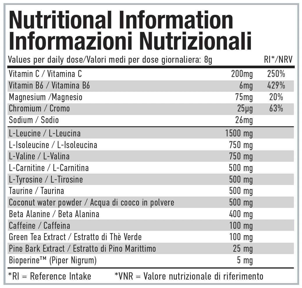 Elle propose une combinaison d'acides aminés essentiels (dont 1500 mg de L-leucine), de 200 mg de vitamine C, de 500 mg de taurine, de 500 mg d'eau de coco en poudre et de 100 mg de caféine.