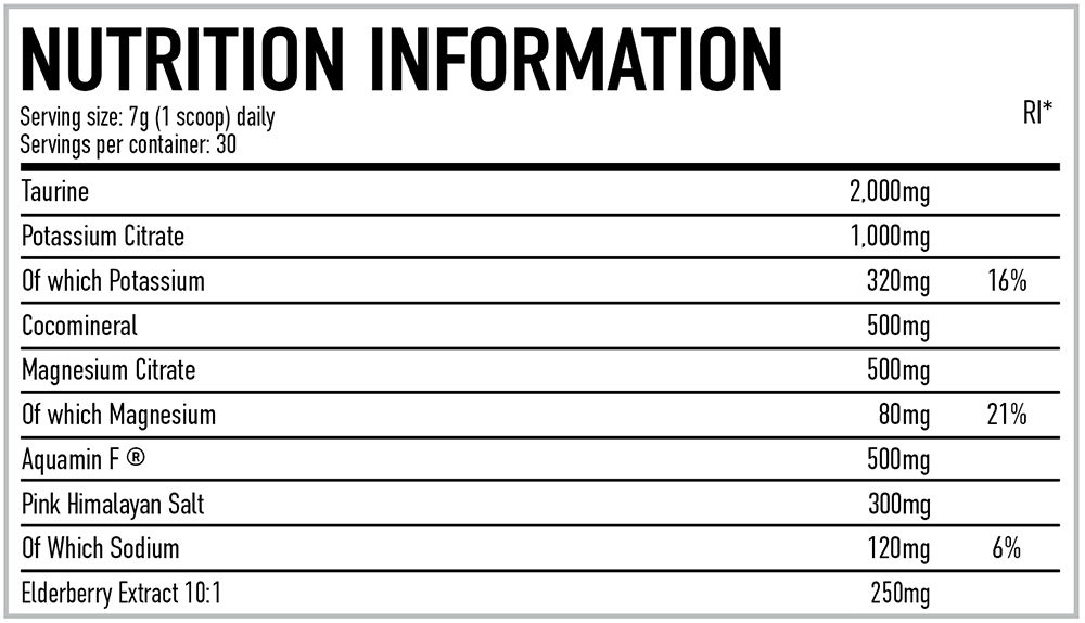 Chaque dose de 7 g fournit 2 g de taurine, 500 mg de CocoMineral® et 300 mg de sel rose d'Himalaya.