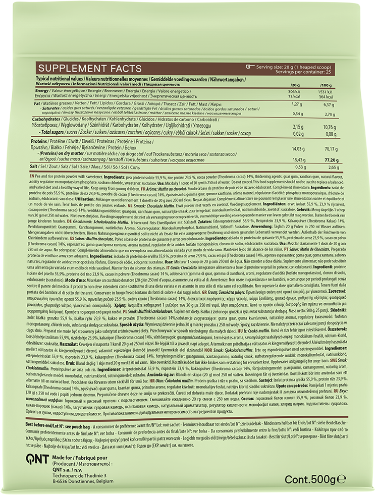 Sans soja, sans lactose et sans sucres ajoutés, QNT Vegan Protein contient entre 71 et 78 kcal par dose (selon la saveur sélectionnée), vous permettant de profiter d'un shake protéiné gourmand, sans culpabilité.