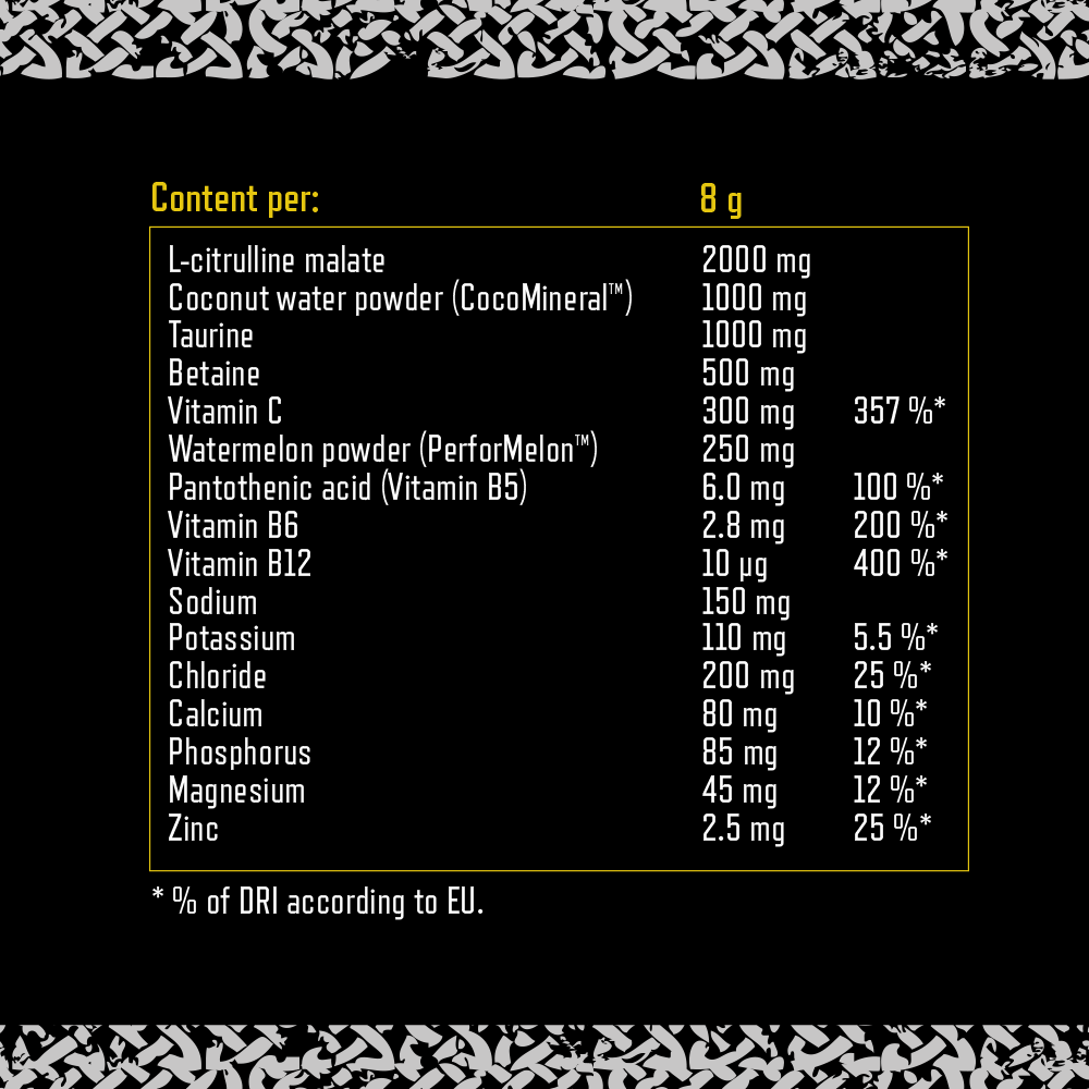 Viking Powder Tears of Frya Hydration est un intra-workout à la formule complète, assurant hydratation (électrolytes, eau de coco en poudre) et apport en éléments contribuant à l'augmentation des performances (L-citrulline, PerforMelon®, vitamines et minéraux) ainsi qu'au développement musculaire (acides aminés essentiels).